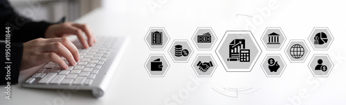 A close-up of hands typing on a keyboard, surrounded by sleek business and finance icons, representing growth, collaboration, and modern technology in a professional workspace. Ledger