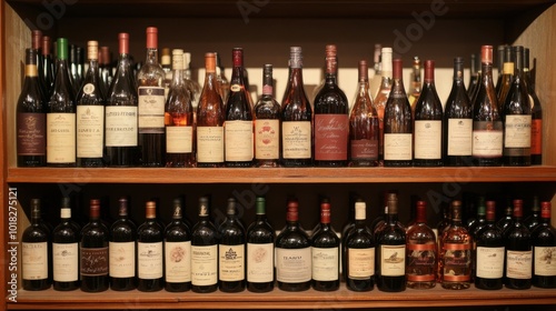 A close-up of multiple wine bottles on display in a wine shop, with neatly arranged shelves and a variety of labels and types.