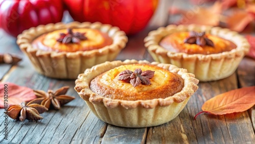 A close-up of three mini pumpkin pies with a star anise on top, resting on a rustic wooden table with scattered autumn leaves.