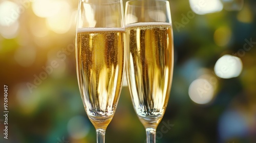 A close-up of two champagne glasses clinking in celebration with a blurred romantic background.