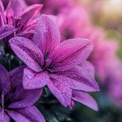 flower, purple, nature, bloom, garden, dew, beauty, freshness, flora, spring, botanical, vibrant, closeup, sunlight, colourful, plant, aesthetic, soft, texture, seasonal, delicate, landscape, macro, scenery, calmness, blossom, wildlife, growth, environment, lush, serene, peaceful, photo, artistic, high-coloured, charme, elegance, detail, ambience, harmony, arrangement, visual, composition, fragrance
