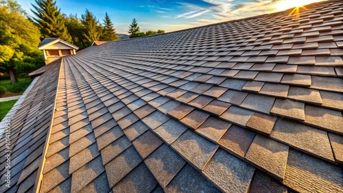 A close-up perspective of a meticulously crafted roof, showcasing the overlapping pattern of tiles bathed in warm sunlight, creating intricate shadows and a sense of depth and dimension.