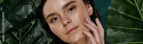 woman, beautiful, caucasian, young, portrait, closeup, face, hand, cheek, touch, green, foliage, plant, nature, beauty, skin, eye, hair, background, vibrant, lush, natural, soft, light, fresh, serene, peaceful, organic, healthy, model, studio, digital, art, dream