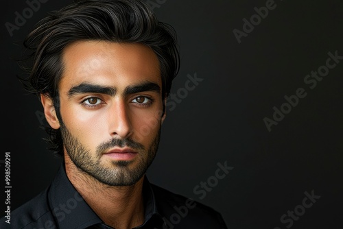 man, portrait, face, young, male, person, human, head, eye, hair, dark, black, beard, stubble field, skin, brown, looking, expression, serious, photogenic, sharpened, sharp, studio, background, simple, collar, shirt, model, fashion, style, casual attire, attractive, gentleman, guy, adult, feature, eyebrow, nose, mouth, chin, neck, shadow, contrast, lighting