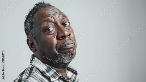 A close-up portrait Of an Older Black man with gray hair and a plaid shirt looking over his shoulder with a serious expression.