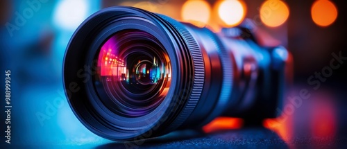 A close-up shot of a camera lens, displaying vibrant reflections and a shallow depth of field against a colorful blurred background.