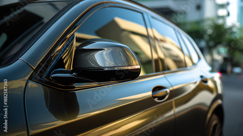 A close-up shot of a modern car's side mirror, reflecting the surroundings