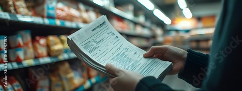A close-up shot of a receipt being held by a hand, taken from behind with a blurred background showing shelves filled with products