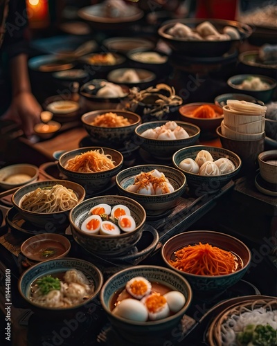 A close-up shot of a vibrant street food market, featuring colorful bowls of Asian cuisine steaming ramen noodles with soft-boiled eggs, sushi rolls,generative ai