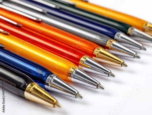 A close-up shot of colorful pens arranged in a row, showcasing their vibrant hues and metallic accents.