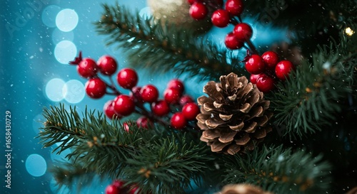 A close-up shot of decorative pine tree branches adorned with pinecones and vibrant red berries, set against a softly blurred blue backdrop.