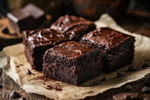 A close-up shot of delectable chocolate brownies arranged on a rustic wooden table, showcasing their rich, fudge texture and irresistible appeal.