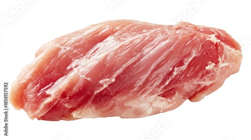 A close-up shot of raw, fresh, pork shoulder meat, isolated on a white backdrop, demonstrating its texture and color