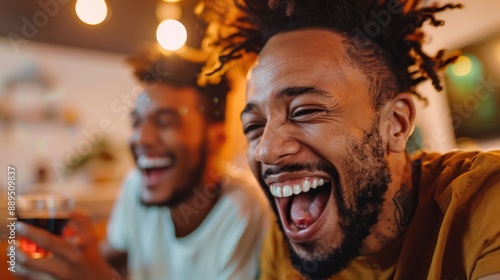 friends, laughter, joy, happiness, fun, bright, smile, closeup, candid, energy, bond, relaxed, casual attire, vibrant, cheerful, togetherness, youth, goodtime, playful, carefree, natural, enjoyment, male, indoor, evening, drink, warmth, affection, connection, love, friendship, gladness, excitement, modern, young, bearded, tender, community, comfort, bonding, contemporary, pleasure, light, delight