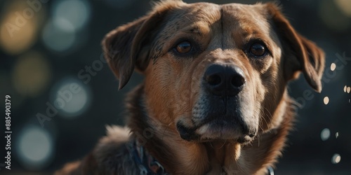 A close-up view of a dog's face with a blurry background Can be used to capture the emotions and expressions of a beloved pet.