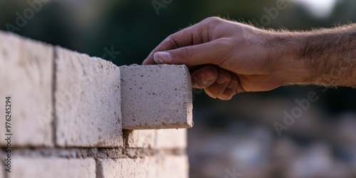 A close-up view of a hand carefully placing a brick on a partially built brick wall, highlighting the importance of construction, craftsmanship, and building something solid and lasting.