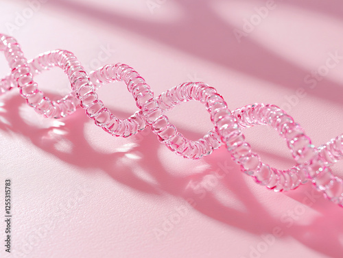 A close-up view of a pink DNA double helix on a soft pink background, with the design evoking a feminine aesthetic. The gentle light creates a harmonious, soothing atmosphere.