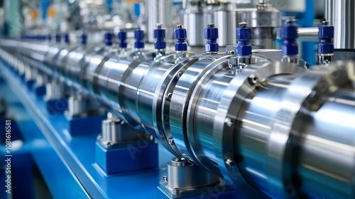 pipe, metal, system, clamp, connector, blue, shiny, industrial, factory, machinery, equipment, manufacturing, production, technology, engineering, automation, process, flow, liquid, gas, pressure, temperature, valva, gauge, sensor, control, safety, maintenance, repair, service, clean, modern, efficient, accurateness, hard-wearing, robust, sophisticated, advanced, innovation