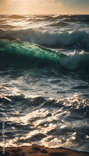 A close-up view of a wave at sunset, with sunlight reflecting off the water's surface. The colors are warm, showcasing shades of orange and blue, creating a serene and dynamic ocean scene.