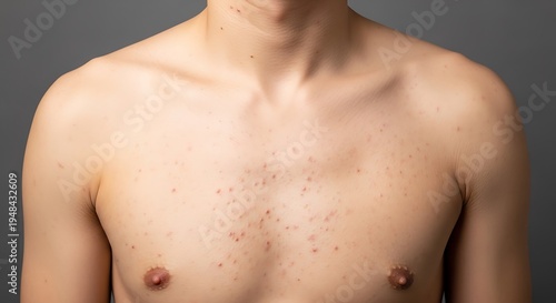 A close-up view of a young man with a chest showing signs of mild acne and skin inflammation issues