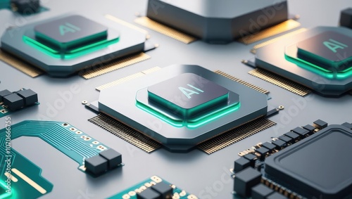 A close-up view of advanced microchips featuring a glowing design, highlighting AI technology and intricate circuitry.