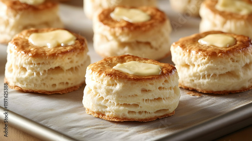 A close-up view of buttery, flaky biscuits arranged neatly on a baking sheet lined with parchment paper, under even lighting
