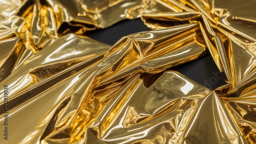 A close-up view of crumpled gold foil, showcasing its shiny surface and intricate folds against a dark background, creating a luxurious and dramatic effect.