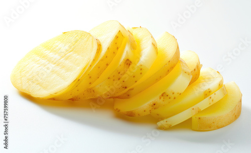 A close-up view of freshly sliced yellow potatoes, showcasing their vibrant color and texture, isolated on a white background.