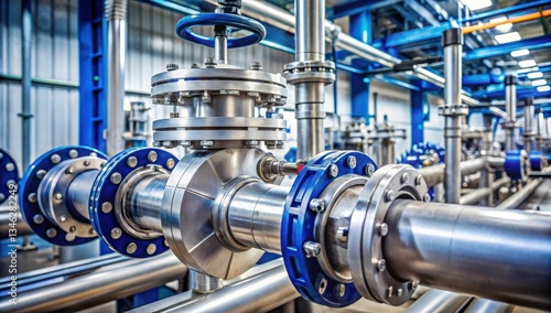 A close-up view of industrial piping and valves, showcasing stainless steel components in a modern factory setting, emphasizing precision and engineering.
