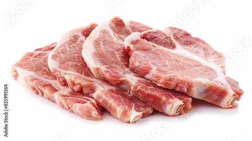 A close-up view of several raw pork chops, arranged in a pile, isolated on a white background