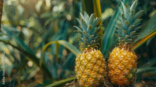 A close-up view of two ripe pineapples growing in a lush tropical garden, illuminated by the warm rays of the sun