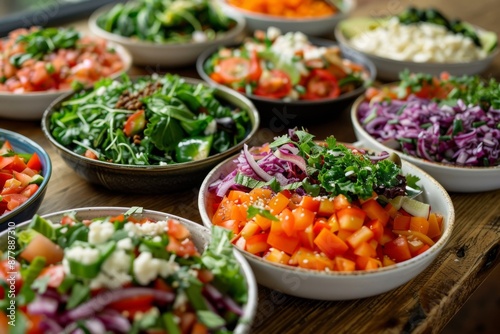 salad, vegetable, dish, bowl, wooden, table, food, colourful, healthy, fresh, ingredient, cookery, lunch, dinner, meal, eatery, catering, party, buffet, closeup, vibrant, appetising, delicious, alimentary, organic, green, red, yellow, orange, purple, white, rustic, texture, pattern, background, stock, commercial, styling