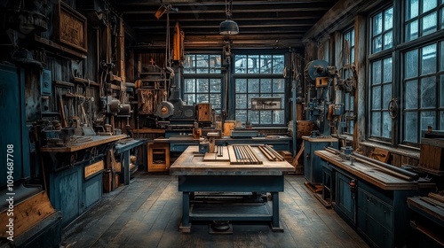 workshop, tool, supply, cluttered, messy, wood, metal, workbench, shelf, window, light, dark, shadow, dusty, vintage, antique, industrial, machinery, equipment, craft, carpenter's shop, metalworking, project, space, organised, chaos, order, work, craftsmanship, skill, creativity, passion, labor, effort