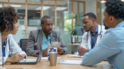 A collaborative meeting scene with diverse healthcare professionals discussing equitable medical access, with a focus on preventing past failures, set in a modern conference room