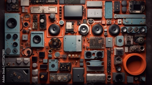 speaker, audio, electronic, technology, sound, music, vintage, retro, device, hardware, component, circuitry, collage, design, abstract, futuristic, minimal, style, modern, contemporary, industrial, metallic, grey, blue, orange, red, pattern, texture, background, wallpaper, artwork, composition, creative, artistic, concept, idea, inspiration