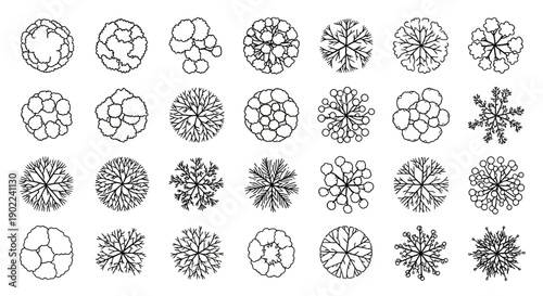 tree, top, view, overhead, plan, drawing, illustration, vignetting, outline, design, architectural, landscape, garden, botanical, nature, plant, foliage, canopy, leaf, tree branch, pattern, texture, symbol, graphic, element, set, collection, variety, different, shape, form, structure, detail, black, white, monochrome, vector, art, representation, symbolic, stylised, simple, clean, modern, flat