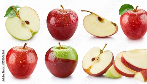 A collection of apples with water droplets and sliced pieces, isolated on a white background. Includes clipping path.