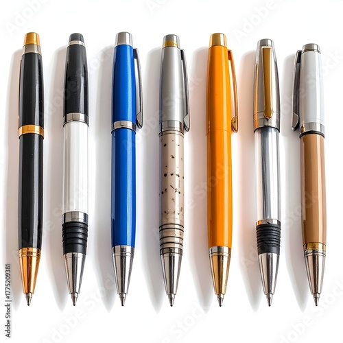 A collection of assorted pens in various colors and designs arranged neatly on a white background