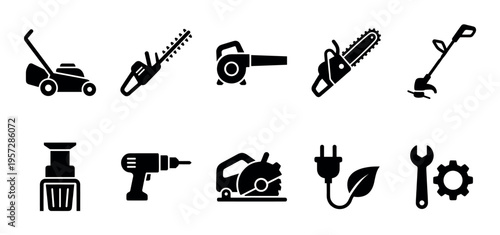 garden, tool, power, equipment, set, icon, illustration, machine, work, lawn, lawn mower, chain saw, blower, drill, saw, wrench, gear, leaf, plug, maintenance, technology, silhouette, graphic, industry, domestic, design, clean, simple, modern, collection, black, white, overhead, object, construction, bricolage, repair, energy, green, nature, electrical, domesticity, industrial, machinery, creation