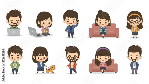 cartoon, character, people, man, woman, children, adult, group, collection, set, illustration, vector, design, cute, flat, style, modern, simple, minimalist, graphic, art, drawing, digital, creative, concept, idea, business, work, office, laptop, computer, technology, communication, phone, call, leisure, home, sofa, couch, relax, casual attire, fashion, goggles, beard, pet, dog, walking