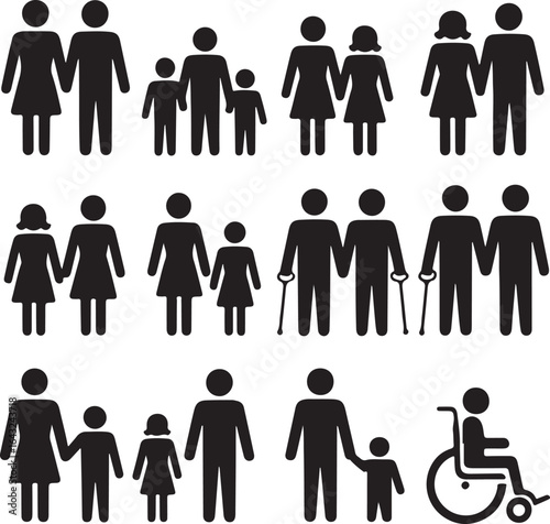 A collection of diverse people icons, showcasing various family structures, relationships, and individuals with disabilities