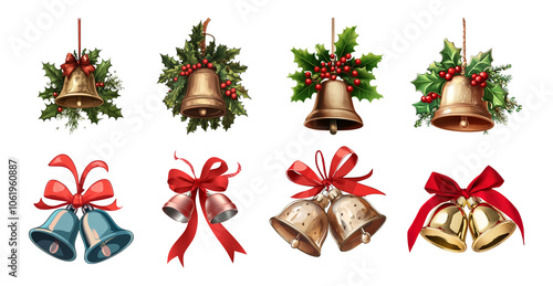 A collection of festive holiday bells adorned with bows and greenery, perfect for seasonal decorations and celebrations.