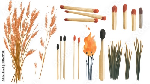 fire, survival, match, flint, dry grass, vector, tool, camping, outdoors, preparation, emergency, wilderness, kindling, spark, ignition, safety, scout, adventure, minimalist, gear, equipment, flames, portable, preparedness, tinder, woodcraft, nature, illustration, modern, essential, striking, detailed, rustic, hand-drawn