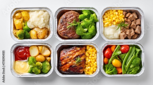 A collection of foil containers displays an array of healthy meals, featuring colorful vegetables, lean meats, and rich sides. Each box is neatly arranged for a convenient dining experience