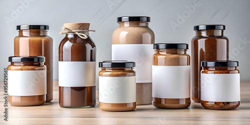 A collection of glass jars and bottles with blank labels. perfect for showcasing your brand's delicious and natural food products.