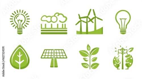 A collection of green icons that represent various aspects of renewable energy. The icons include a light bulb, a windmill, a solar panel, and a tree. Scene is one of sustainability