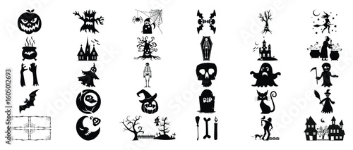 A collection of halloween themed illustrations in black silhouette on a white background