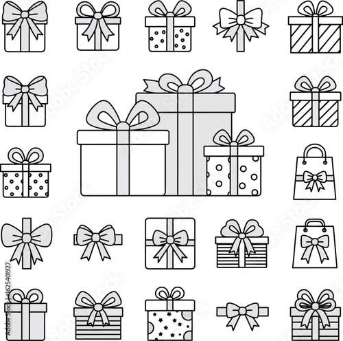 A collection of line art illustrations featuring various gift boxes and shopping bags, each adorned with different bow styles and patterns.