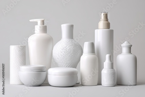 A collection of sleek, white cosmetic containers of varying shapes and sizes, including bottles, jars, and tubes, arranged on a neutral gray background