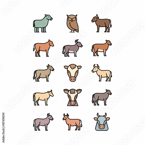 animal, farm, farm animal, mammal, bird, horse, cow, bull, goat, donkey, ox, owl, icon, vector, illustration, graphic, cartoon, drawing, outline, flat, design, collection, set, variety, domestic, wild, nature, creature, fauna, art, simple, character, symbol, head, body, profile, front, side, standing, brown, green, grey, beige, white, black, blue, pink, orange, agriculture